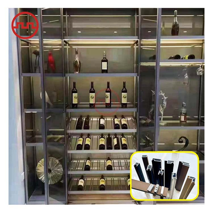 غرفة المعيشة وغرفة الطعام والمطبخ والبار خزانة عرض خشبية من الألومنيوم وخزانة نبيذ زجاجية وملف من الألومنيوم